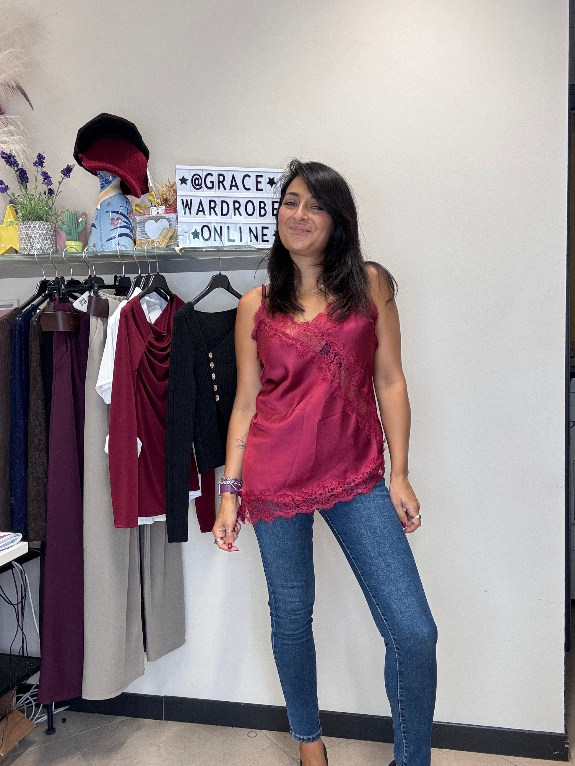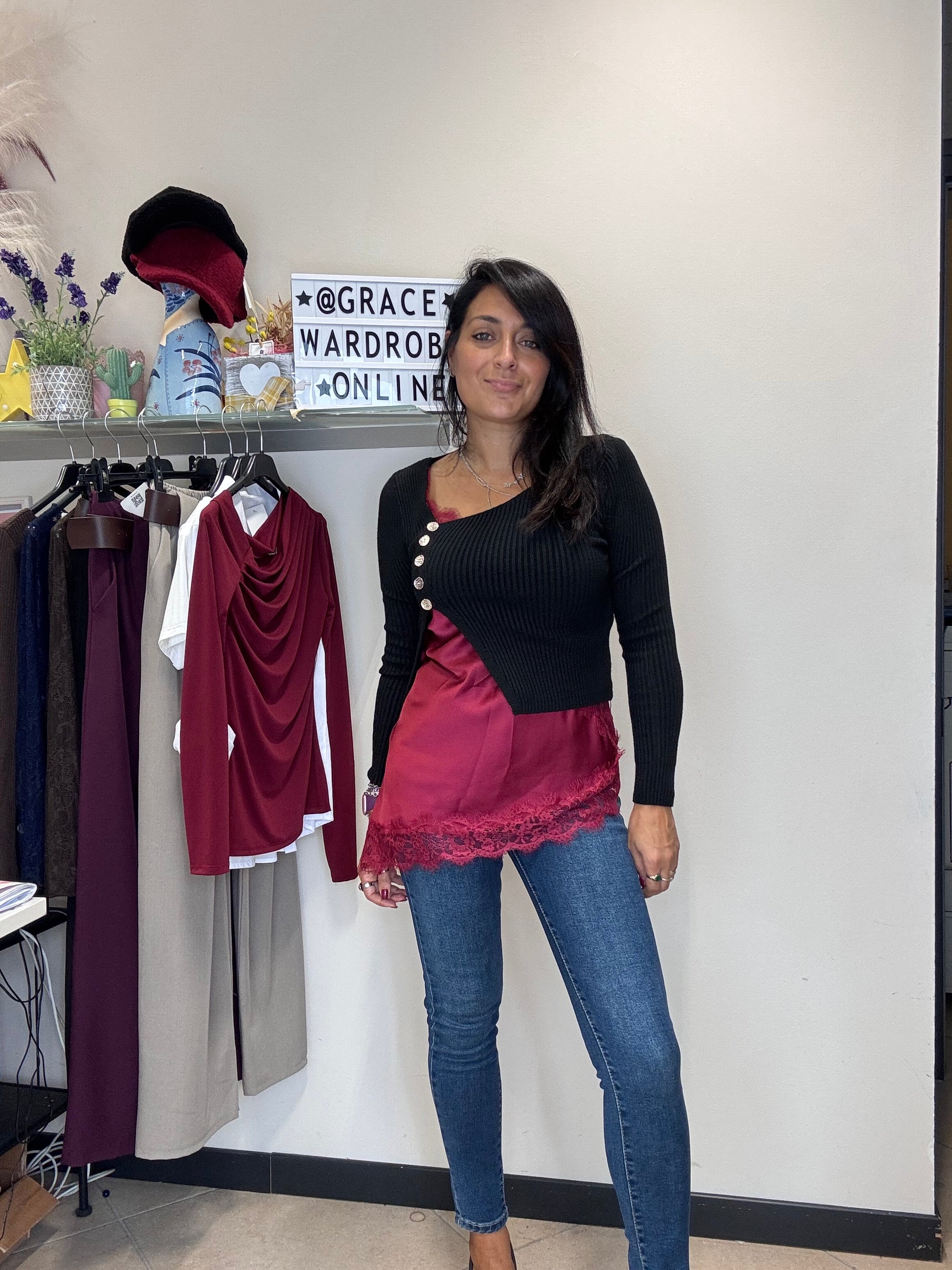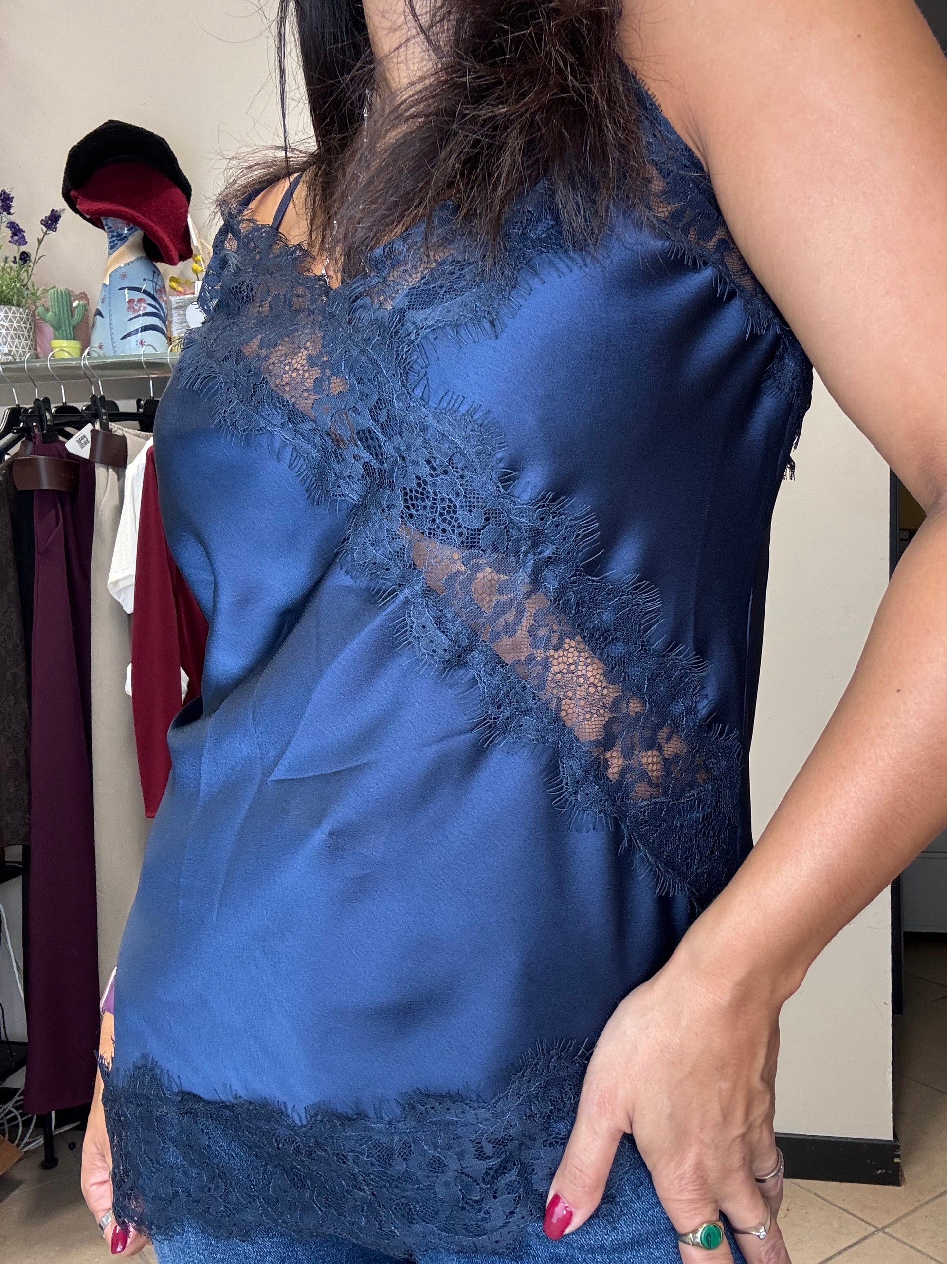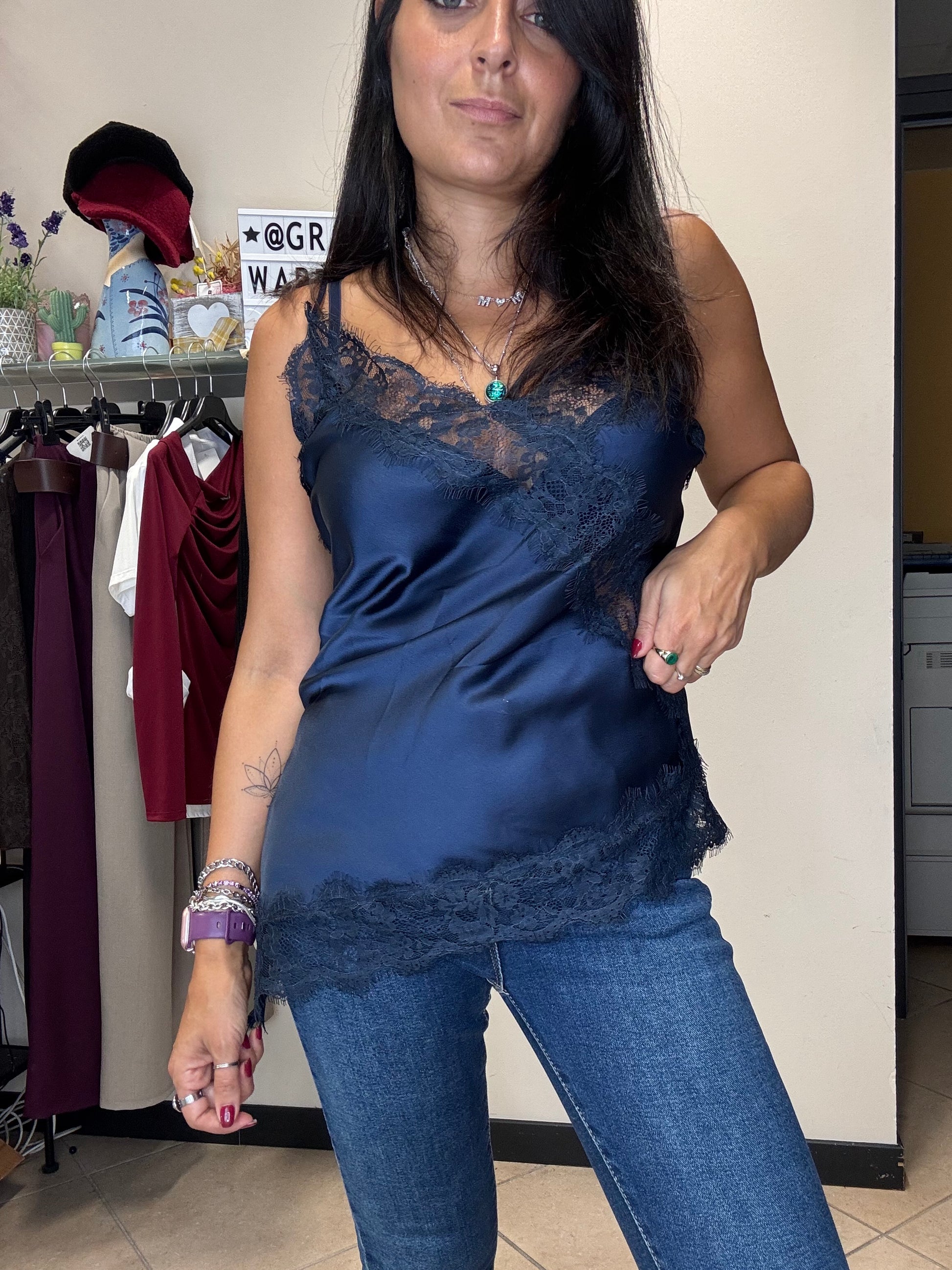 Canottiera asimmetrica con rifiniture in pizzo,taglia unica veste fino alla L.