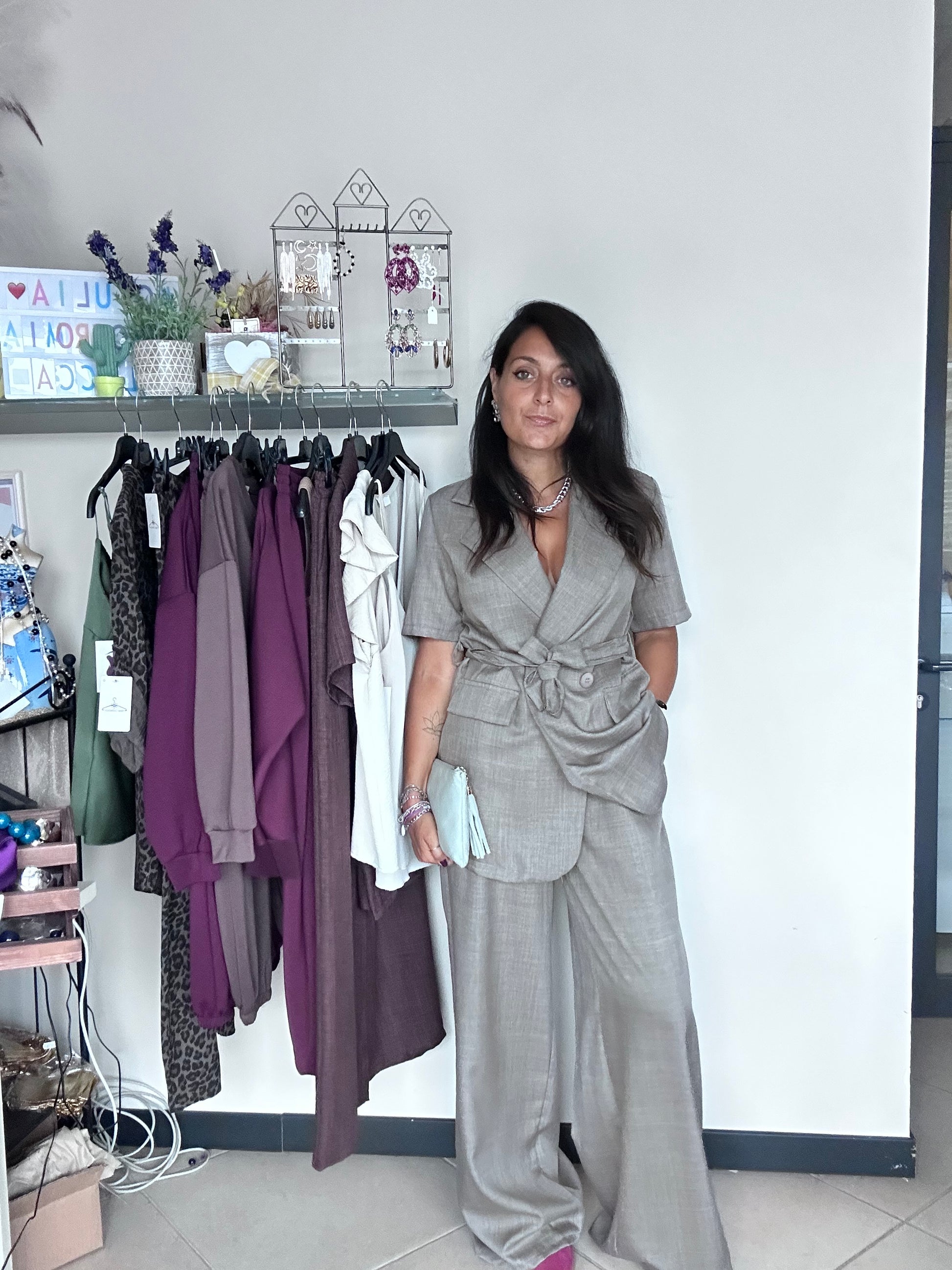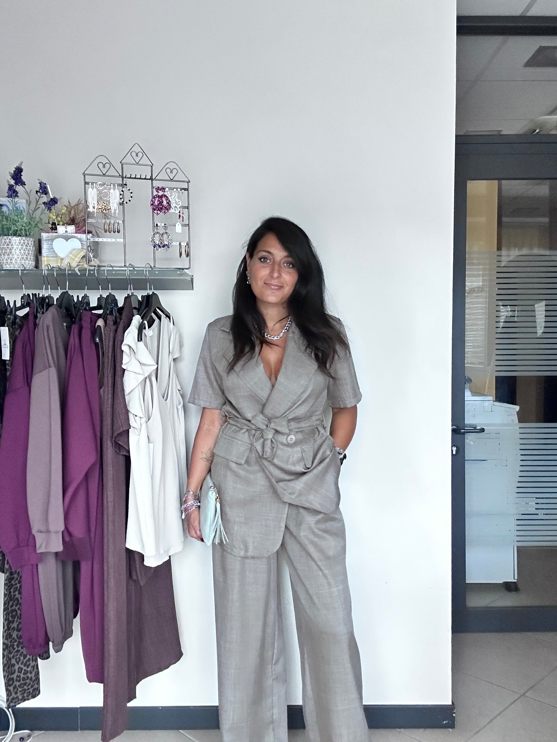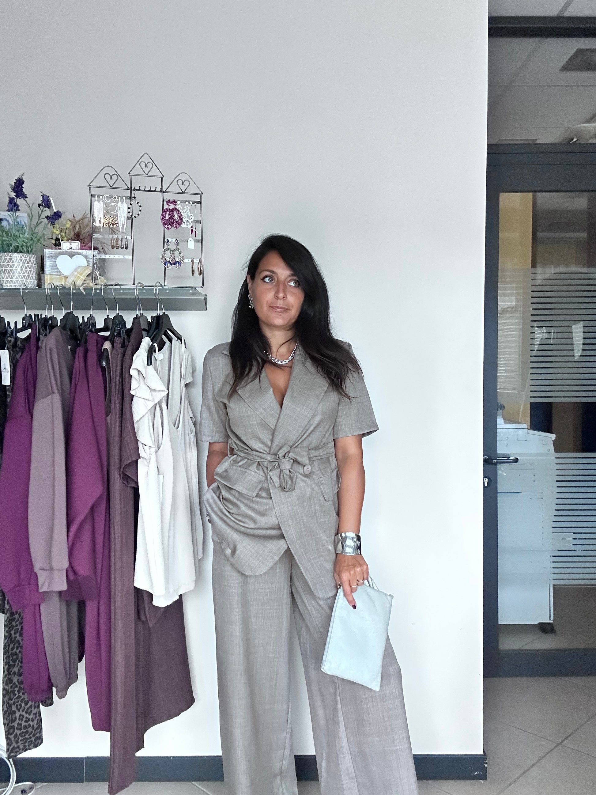 Completo composto da giacca e pantalone con elastico in vita .